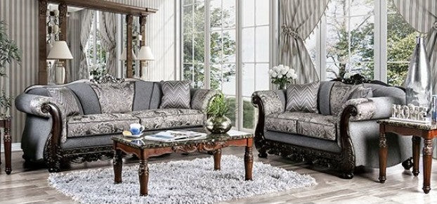 SM6424 2 pc Rosdorf park newdale gray chenille dark walnut wood trim traditional sofa and love seat set. Sofa and Love seat features chenille upholstery and dark walnut wood trim with carved accents. . Sofa measures 93″ x 36″ x 40″ H. Love seat measures 70″ x 36″ x 40″ H. Some assembly may be required.